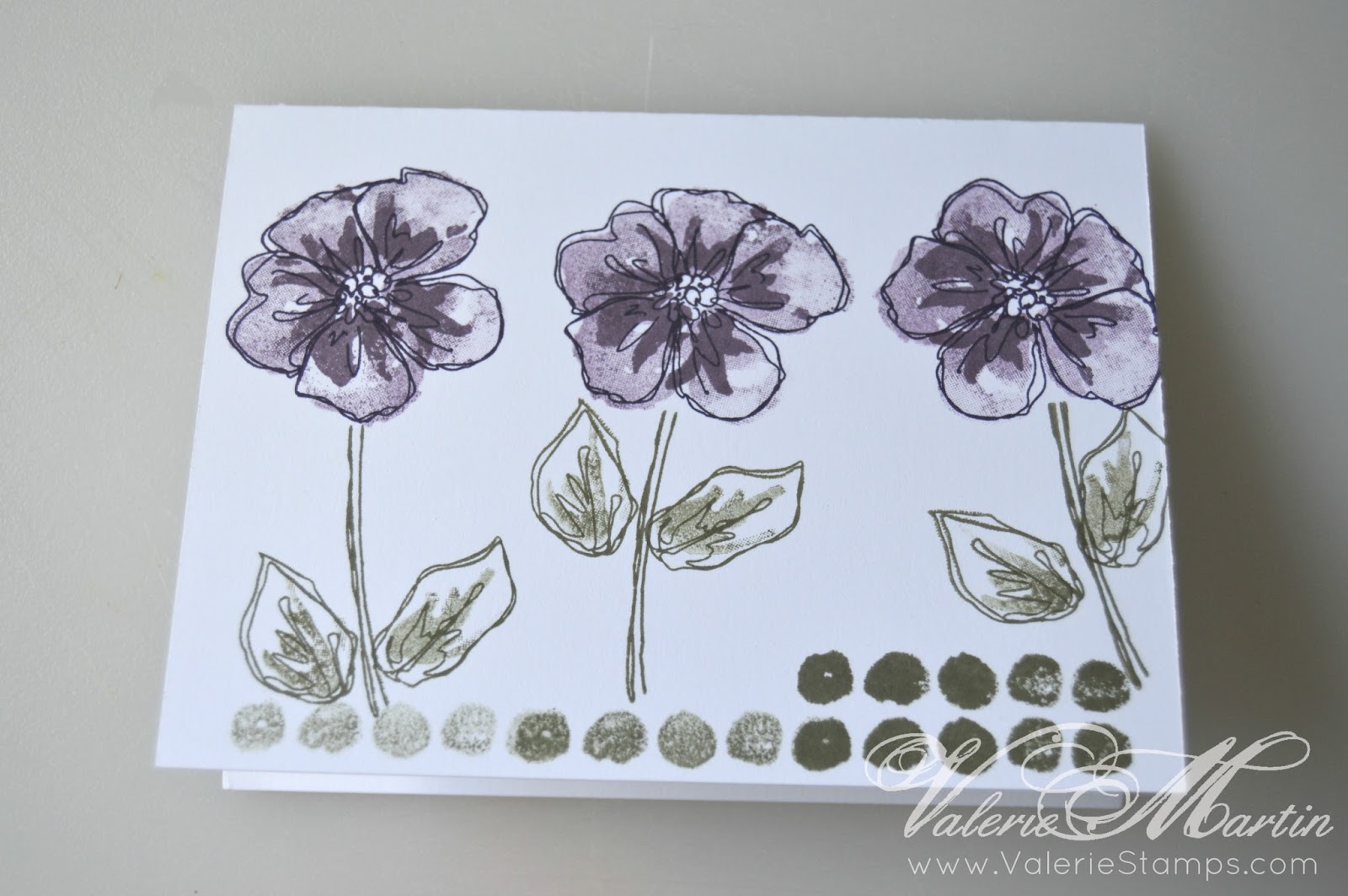 TIP: Give a "natural" look to your stamped flowers by making each one a little different. Even though they are in a row, each blossom is rotated differently. Since this is a photopolymer stamp set, I bent the stem a little differently before I stamped each stem. Finally, I made sure the leaves were all on different levels.